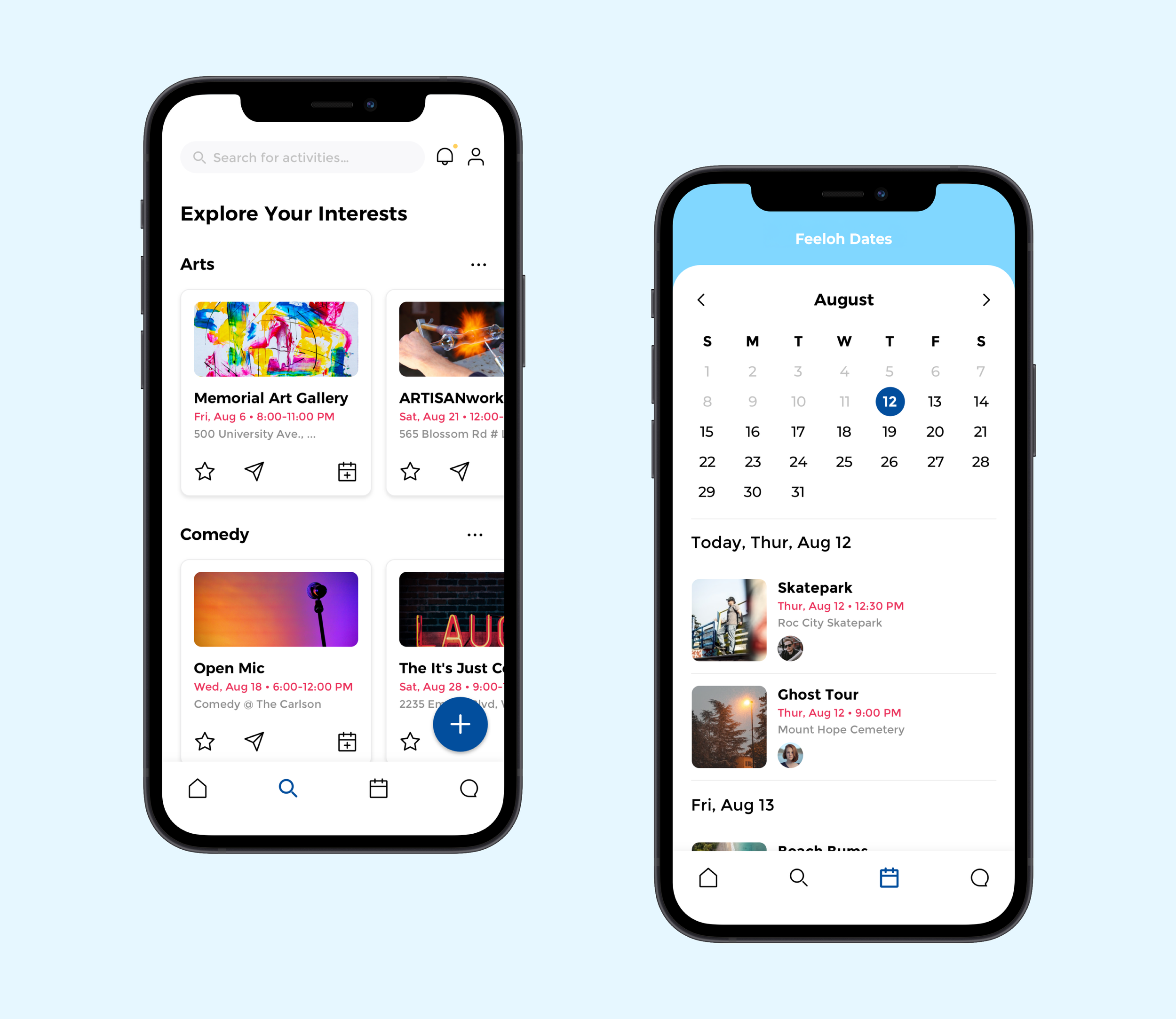 Feeloh is built around natural human behavior. Custom-curated features help users quickly decide on activities and make plans with friends, family, and partners in one place. The interface is engaging and information-rich, designed to get people off their phones and into real-world experiences together.