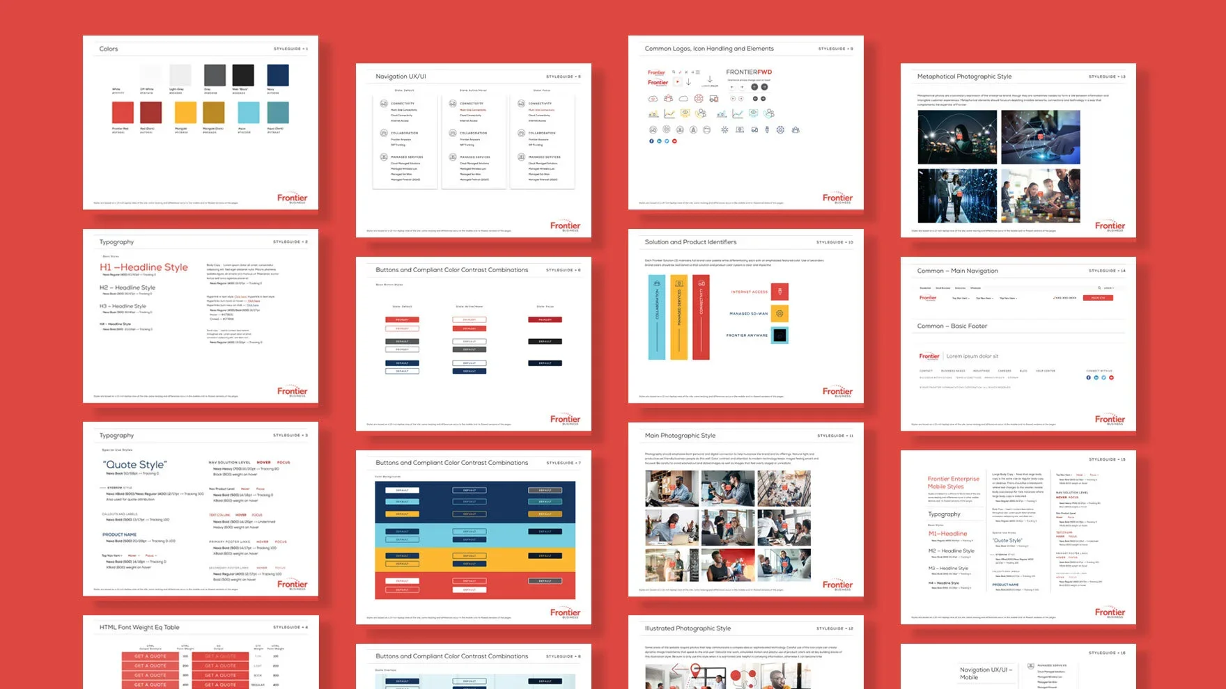 Including an extensive set of “Frontier icons” and template modules with built-in functions and stylings, our library and guidelines not only have taught the Frontier team how to maintain brand standards but also enabled them to execute seamlessly across their entire system.