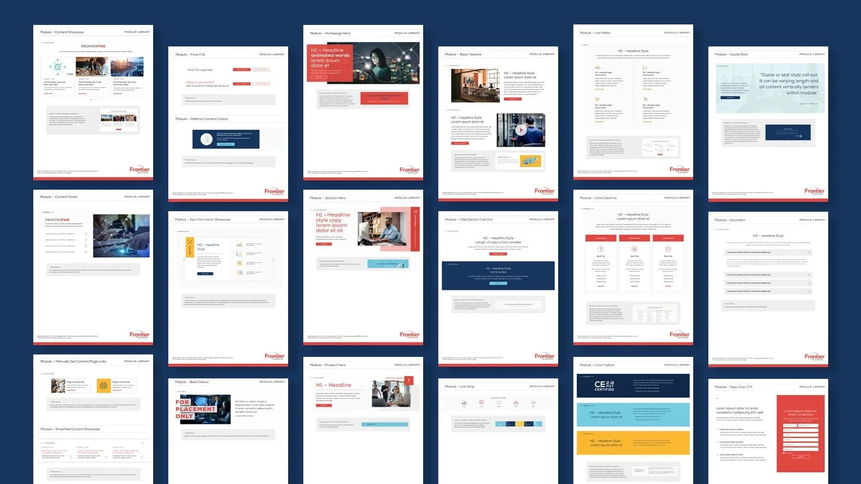By creating a new design system, we developed a multipurpose module library with a supporting web style guide and visual assets to help the Frontier team establish a consistent experience.